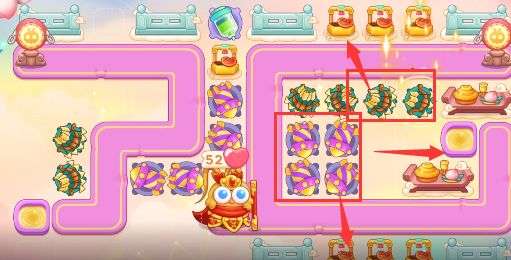 6、放置炮塔如图所示,主要输出位置都适用多重箭,靠近萝卜的位置放置烟花,在出口放置泡泡塔减速。