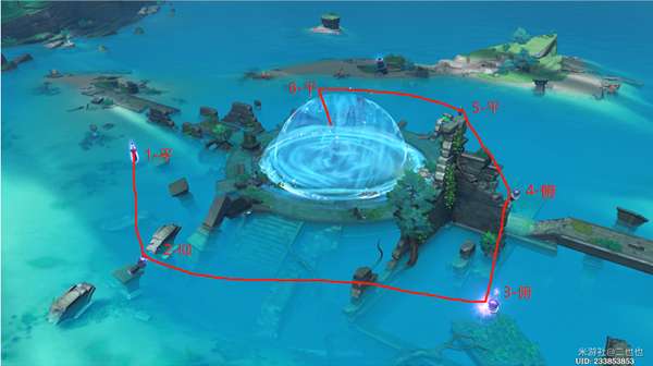 2、①是御引磐座,②③④⑤⑥是雷承之鉴,旋转好柱子后再去攻击①。