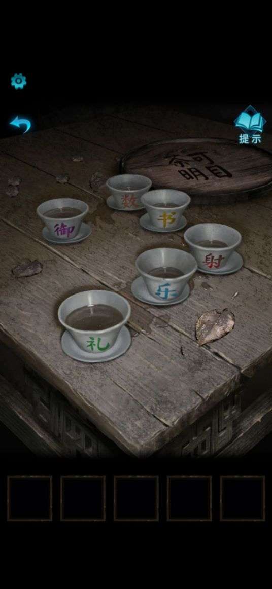 ④把香灰水倒入院内桌子上的茶杯里,显现出字样,根据提示解开院内箱子的密码:礼(绿)-乐(蓝)-射(红)-书(黄)-数(橙)-御(粉)