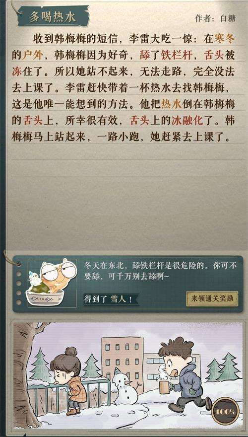 1、多喝热水:收到韩梅梅的短信,李雷大吃一惊:在寒冬的户外,韩梅梅因为好奇,舔了铁栏杆,舌头被冻住了。所以她站不起来,无法走路,完全没法去上课了。李雷赶快带着一杯热水去找韩梅梅,这是他唯一能想到的方法。他把热水倒在韩梅梅的舌头上,所幸很有效,舌头上的冰融化了。韩梅梅马上站起来,一路小跑,她赶紧去上课了。