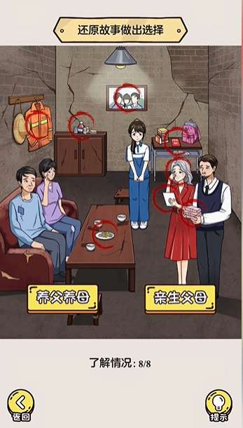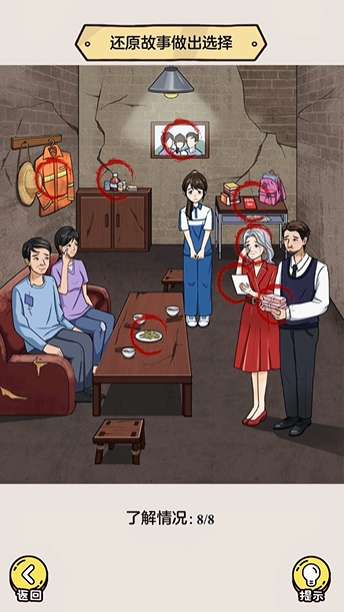 2、然后来到第二个场景,点击相框、墙上的衣服、书包旁的红本、餐桌上的食物、白发女人、手中的纸和盒子。