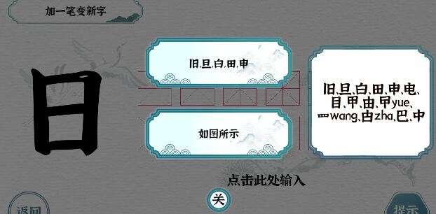 2、思考过后可以知道加一笔变成的新字有【旧】、【旦】、【白】、【田】、【申】、【电】、【目】、【甲】、【由】、【曱】、【罒】、【甴】、【巴】、【中】。