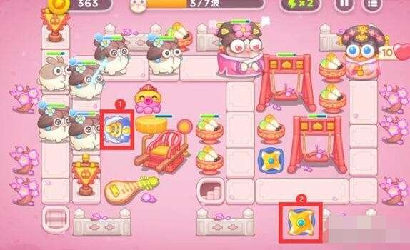 1、第一步在左边中间的空地处放置章鱼炮台并升级到最高级,这个很关键因为前期的小怪和路障都需要他来清除,第二步,在右下角设置风扇炮台,开局这样摆放足够清理第一波