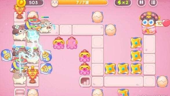 3、接着继续升级最右边的风扇炮台,它可以很快地清除路障获取金币。升级完之后在左边的章鱼炮台旁边再下一个章鱼炮台