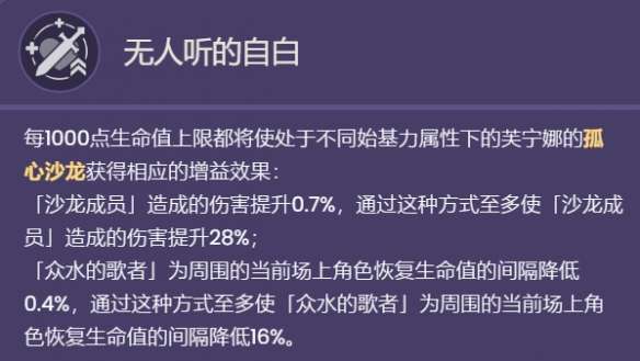 「沙龙成员」进行攻击时,若队伍中存在生命值高于50%,并处在附近的角色,则会消耗这些角色的生命值,并依据「奉献」了生命值的角色数量,提升此次攻击的威力:消耗生命值的角色数量为1/2/3/4名或更多时,攻击造成的伤害为原本的110%/120%/130%/140%。