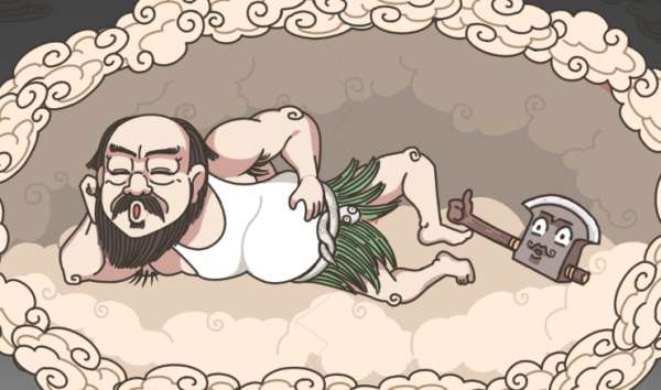 1、进入游戏后可以看到盘古在一个云团也一样的蛋克里面睡觉,在脚边还有一把斧头,这就是开天的工具?