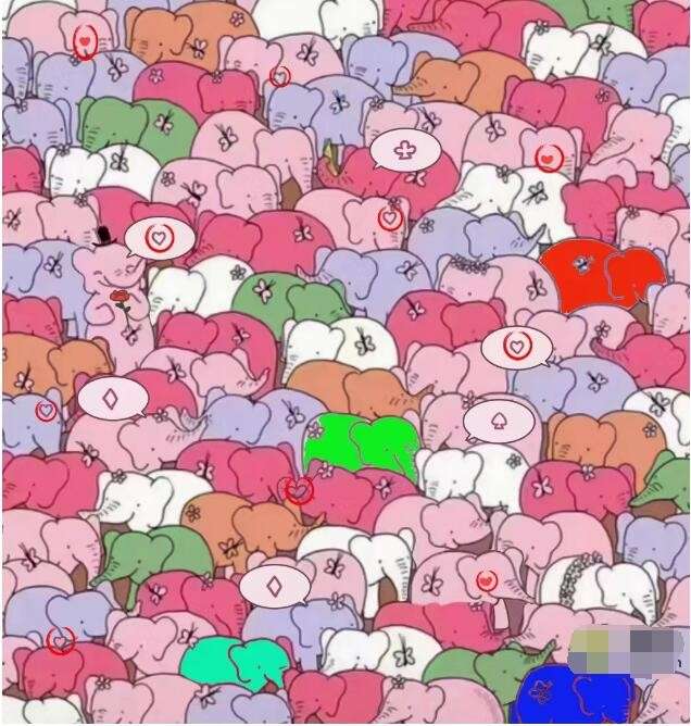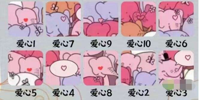 1、汉字派对-找出10个爱心位置如图所示,分别在左上角、左下角、中间粉色大象、右上角粉色大象、白色对话框里、右下角粉色大象等