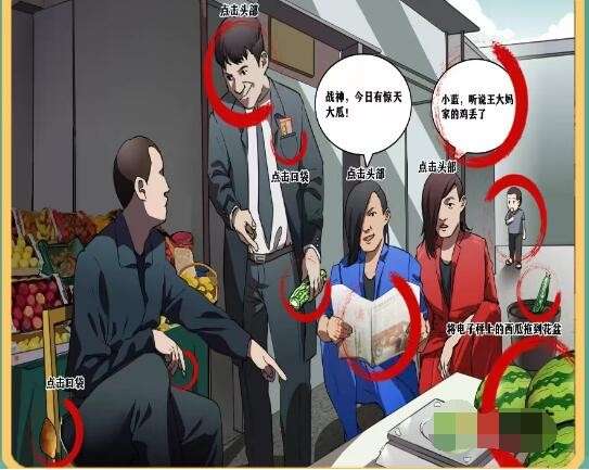2、点击左边的人口袋可以找到地瓜,点击白衬衣的人找到歪瓜裂枣,他手里是苦瓜,点击口袋找到刮刮乐