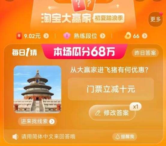 以上就是小编带来的从大赢家进飞猪有何优惠,淘宝大赢家今日答案6月28日,更多相关资讯教程,请关注创意手游网。