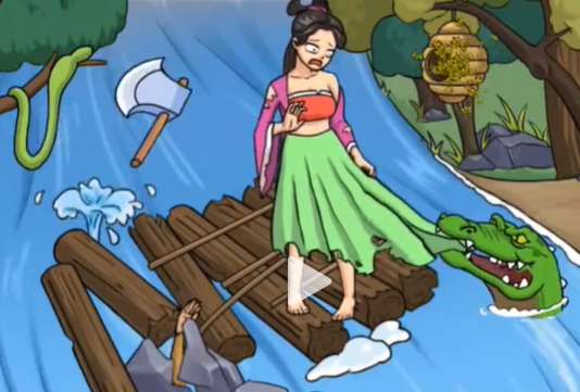 5、将烧鸡插在下面的木头上使其能够顺利的绕开鳄鱼。