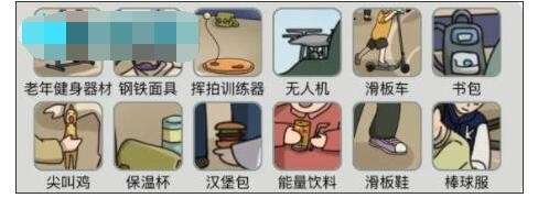 烧脑找茬儿时回忆4答案:老年健身器材、钢铁面具、挥拍训练器、无人机、滑板车、书包、尖叫鸡、保温杯、汉堡包、能量饮料、棒球服
