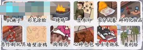 挑战巨人妈见打答案:扒裤子、彩笔涂脸、烤鸡、墨水印、零分试卷、碎的化妆品、恶作剧玩具、墙壁涂鸦、掏棉花、心碎包包、哈士奇拆床、奥利给