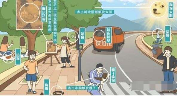 1、【找狗】关卡需要找到8个狗,分别是:热狗、阿尔法狗、菜狗、狗绳、嘎子偷狗、拉布拉多、狗狗太阳、甜狗