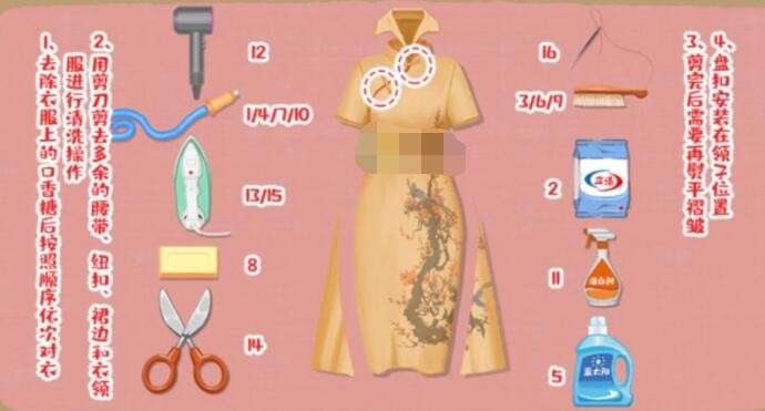 1、【泥裳羽衣】关卡需要清洗旗袍,首先将衣服上的脏东西拿开,用水冲洗