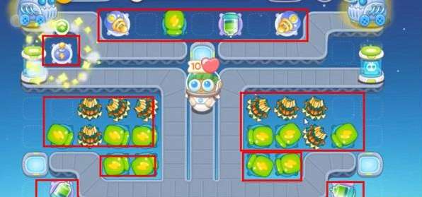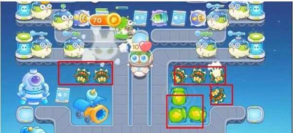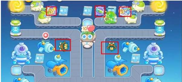 3、这一关卡开很快的赚金币也很快,玩家需要在刷怪传送带安放一个毒针筒减速兔兔们,如下图所示。