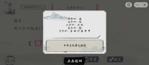 玩梗大师游戏是抖音近期刚热火的新游戏,游戏中有多个模式,最新关卡模式之中——大嘴拼字2.0怎么过,这一关需要用六七八九十个口拼字!下面是创意手游小编给大家带来的抖音《玩梗大师》大嘴拼字2.0通关攻略,感兴趣的小伙伴们一起来看看吧。