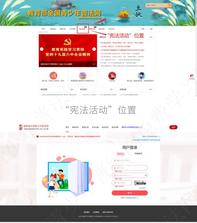 方式二:进入网页版在线学习(电脑)搜索教育部全国青少年普法网,点击“宪法活动” ,右上角点击“登录”参与学习。