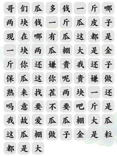 文字玩出花小游戏是一款文字题材闯关冒险手机游戏,关卡买瓜之歌怎么过?玩家需要将文字之间进行构词,从而消除文字,文字完全消除即可通关,如下“哥们瓜多钱一斤哪”、“两块钱一斤”、“你这瓜保熟吗”这些内容。下面是创意手游小编给大家带来的《文字玩出花》买瓜之歌消除对应歌词通关攻略,还没有通关的小伙伴可以来看看,希望能帮助大家!
