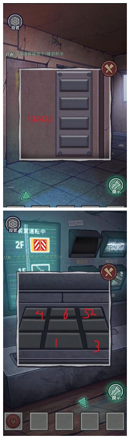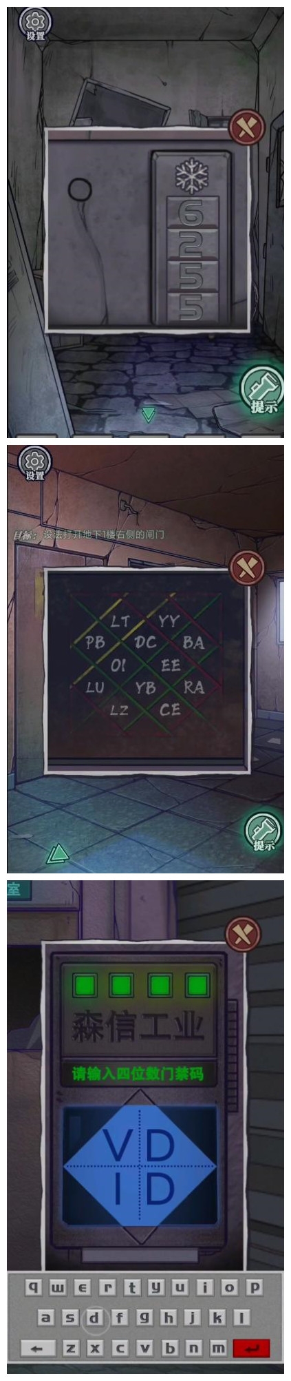 地下一层甬道尽头的密码为【6255】得到【IC卡】,按照之前的方法再制作一份试剂使用在研究员室右边的水龙头上,再用一次试剂获得【调和过的试剂】,用在控制室外的脏了的玻璃上,后勤室地上漏了个【脏抹布】,用抹布沾水再擦一遍玻璃,在地下一层右边的闸门使用IC卡,输入密码【VDID】