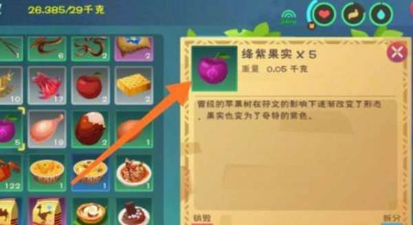 2、去天空岛砍伐紫色的树木,掉落绛紫果实。