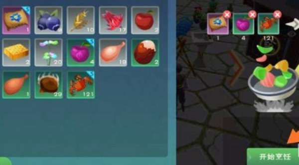 5、把大闸蟹、绛紫果实、蓝莲饲料放到锅里,点击开始烹饪。