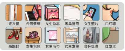 连衣裙、合照的电脑壁纸、女生杂志、床单折痕、女生纸片、口红印、高跟鞋、女生包包、女生毛巾、女生发箍、交杯红酒、红发丝。