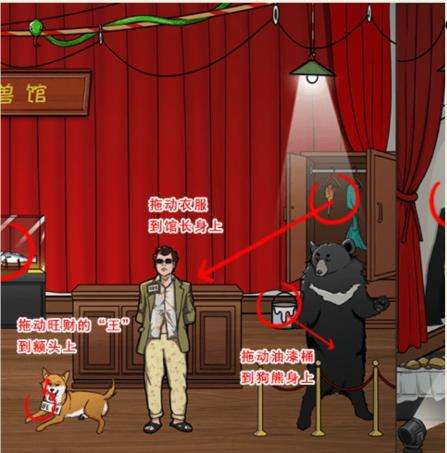 2、移动狗身上牌子上的王字到额头上变成老虎,打开柜子将衣服穿在馆长身上成为美人鱼。