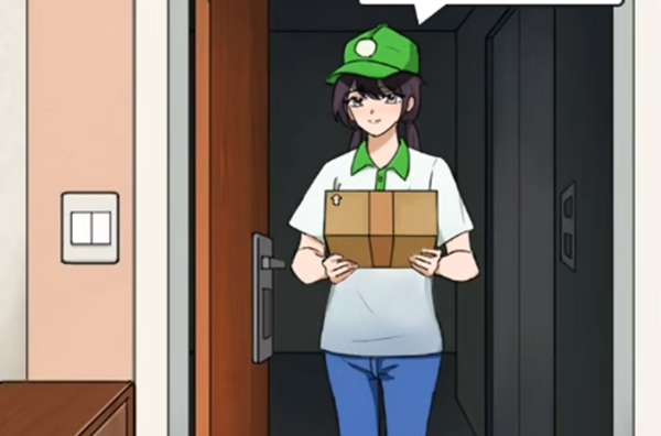 7、最后玩家打开门会发现是一个快递员,然后点击开关,关闭电灯之后,快递会掉落下来,我们捡起来纸条即可通关。