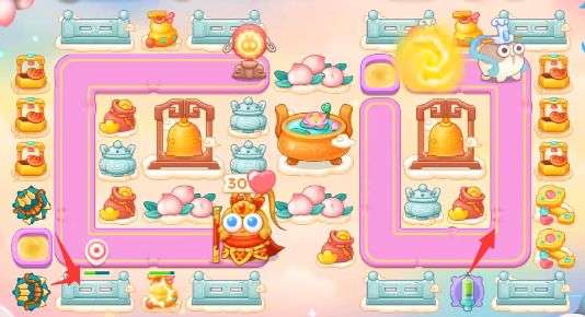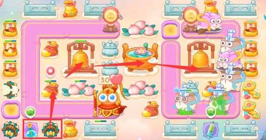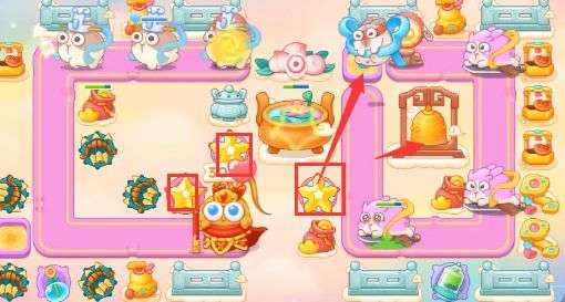 1、这一关我们可以选择的炮塔为毒针、多重箭、泡泡塔、星星、烟花,这一关我们使用多重箭输出星星防空。