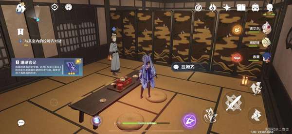 传送稻妻城,返回木漏茶室,与右边房间内的拉齐姆对话