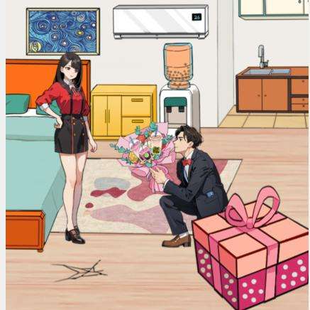 2、点击花束、饮水机、水龙头、空调、床头柜、厨房上面的柜子、男人兜里的手机