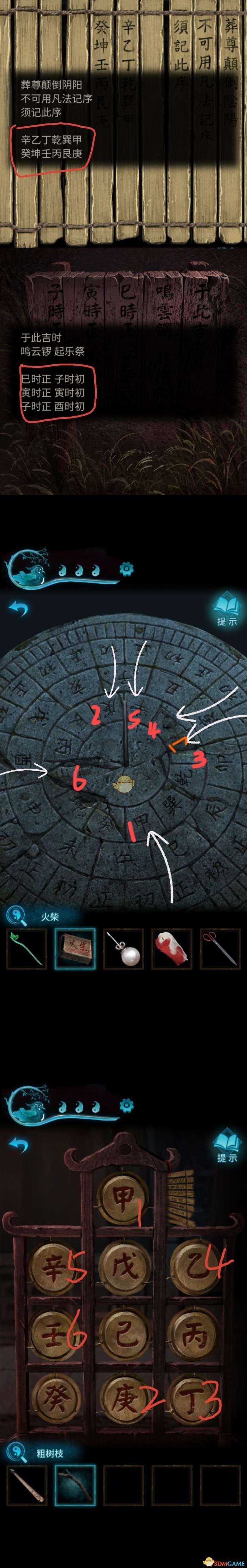 点击中间的牌子,按照:甲-庚-丁-乙-辛-壬 用粗树枝敲打