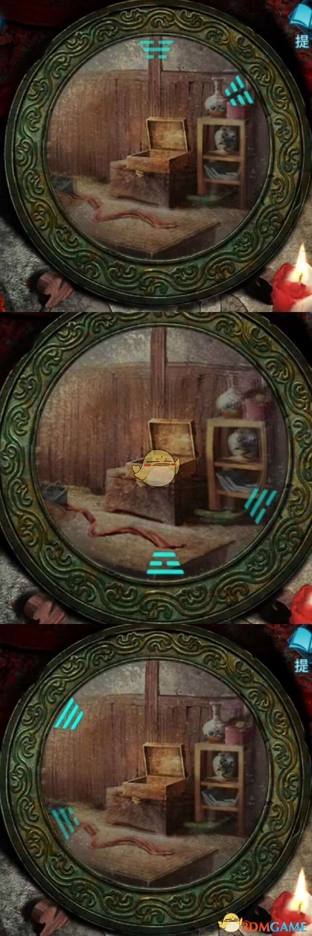 ⑤将古镜放到车后面的案台上,放上杂色蜡烛,用火柴点燃,获得八卦镜线索,图6所示