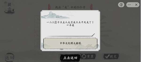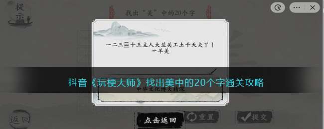 玩梗大师游戏是抖音近期刚热火的新游戏,游戏中有多个模式,最新关卡模式之中——找出美中的20个字怎么过,这是一个找字关卡,找出美字中的20个汉字,不能有重复。下面是创意手游小编给大家带来的抖音《玩梗大师》找出美中的20个字通关攻略,感兴趣的小伙伴们一起来看看吧。