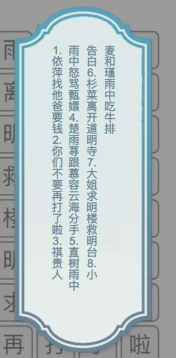 1、进入关卡我们看到有许多情景和语句,需要我们连连看,感觉这一关有点难度,比如依萍找他爸要钱,雨真的很大呀