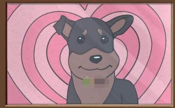 2、然后将下方的彩色沙子倒在撕好的地方,周围的爱心是两种粉色交替分布,中间的狗狗整体是黑色的,嘴巴、眉毛、耳朵等部分是棕色的
