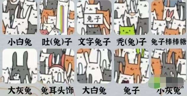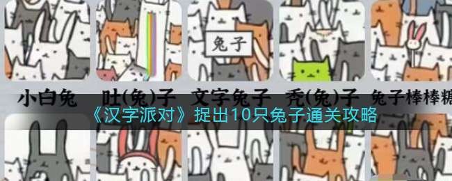 1、汉字派对【捉出10只兔子】分别有:小白兔、吐(兔)子、文字兔子、秃(兔)子、兔子棒棒糖,大灰兔、兔耳头饰、大白兔、兔子、小灰兔