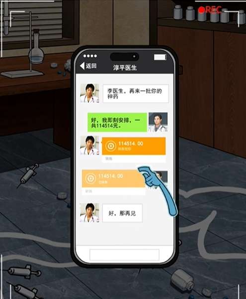3、先进入地上划线的房间,点击药瓶、地上的药、针管、聊天记录、桌上的试管、实验记录