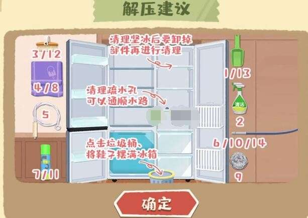 6、清理完之后再把部件装回冰箱,点击垃圾桶把鞋子放进去即可通关