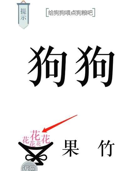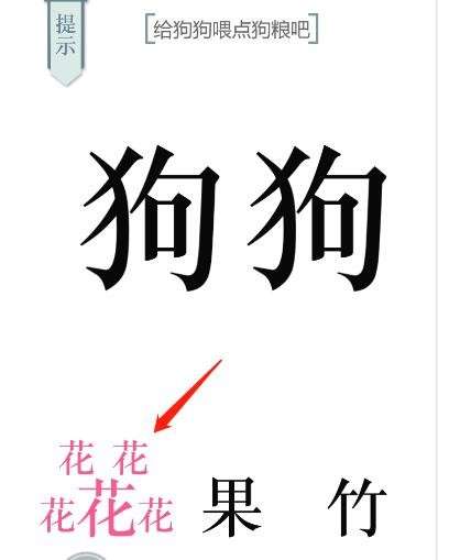 1、这个关卡中有:狗、花、竹等三种字,点击【花】四次,会出现四朵小花在边上,如下图所示。