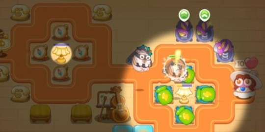 1.在右侧能够看到只有小小的亮圈,大家需要先购买木板填补空洞,才能够放置武器,先在台灯旁边放置两个绿色炮台,等兔子开始出现时,亮圈会变大,玩家看到的道具和兔子也就越多。