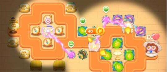 2.等到台灯周围放置四个绿色炮台的时候,第一只冷冻兔子出现,被消灭后, 会暂时冻住附近的一个炮台,无法对后面的兔子进行攻击,这时候就需要借助其他的炮台清除其冰块。