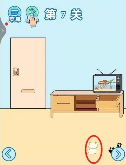 切换到右边的场景,打开图示抽屉拿到电视机遥控器,然后是用遥控器打开电视机,随后抱走前来看电视的小猫咪